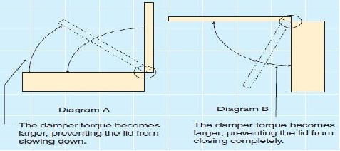 1. When incorporating a damper on a lid, it is essential to calculate the appropriate damper torque using the specified selection calculation method as illustrated in the diagram.